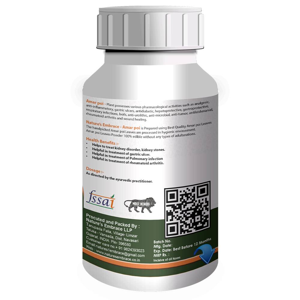 Nature’s Embrace – Amar poi is Prepared using Best Quality Amar poi Leaves. The handpicked Amar poi Leaves are processed in hygienic environment. Amar poi Leaves Powder 100% edible without any types of adulterations.