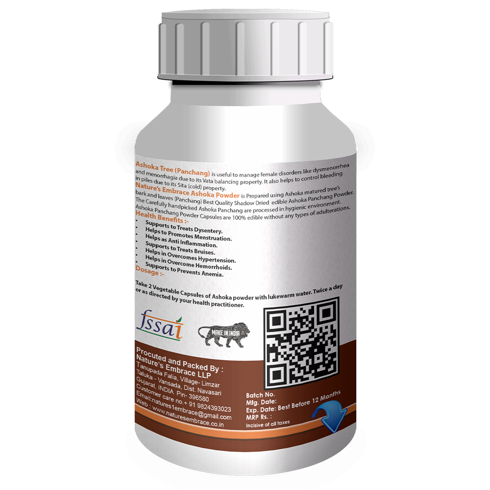 Nature’s Embrace Ashoka Powder is Prepared using Ashoka matured tree’s bark and leaves (Panchang) Best Quality Shadow Dried edible Ashoka Panchang Powder. The Carefully handpicked Ashoka Panchang are processed in hygienic environment. Ashoka Panchang Vegetable capsules are 100% edible without any types of adulterations.