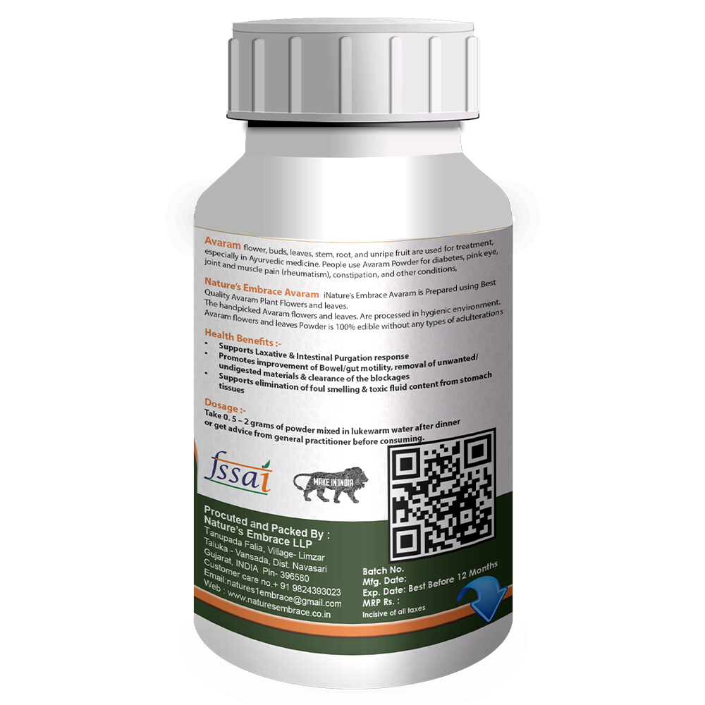 Nature’s Embrace Avaram is Prepared using Best Quality Avaram Plant Flowers and leaves. The handpicked Avaram flowers and leaves. Are processed in hygienic environment. Avaram flowers and leaves Powder is 100% edible without any types of adulterations
