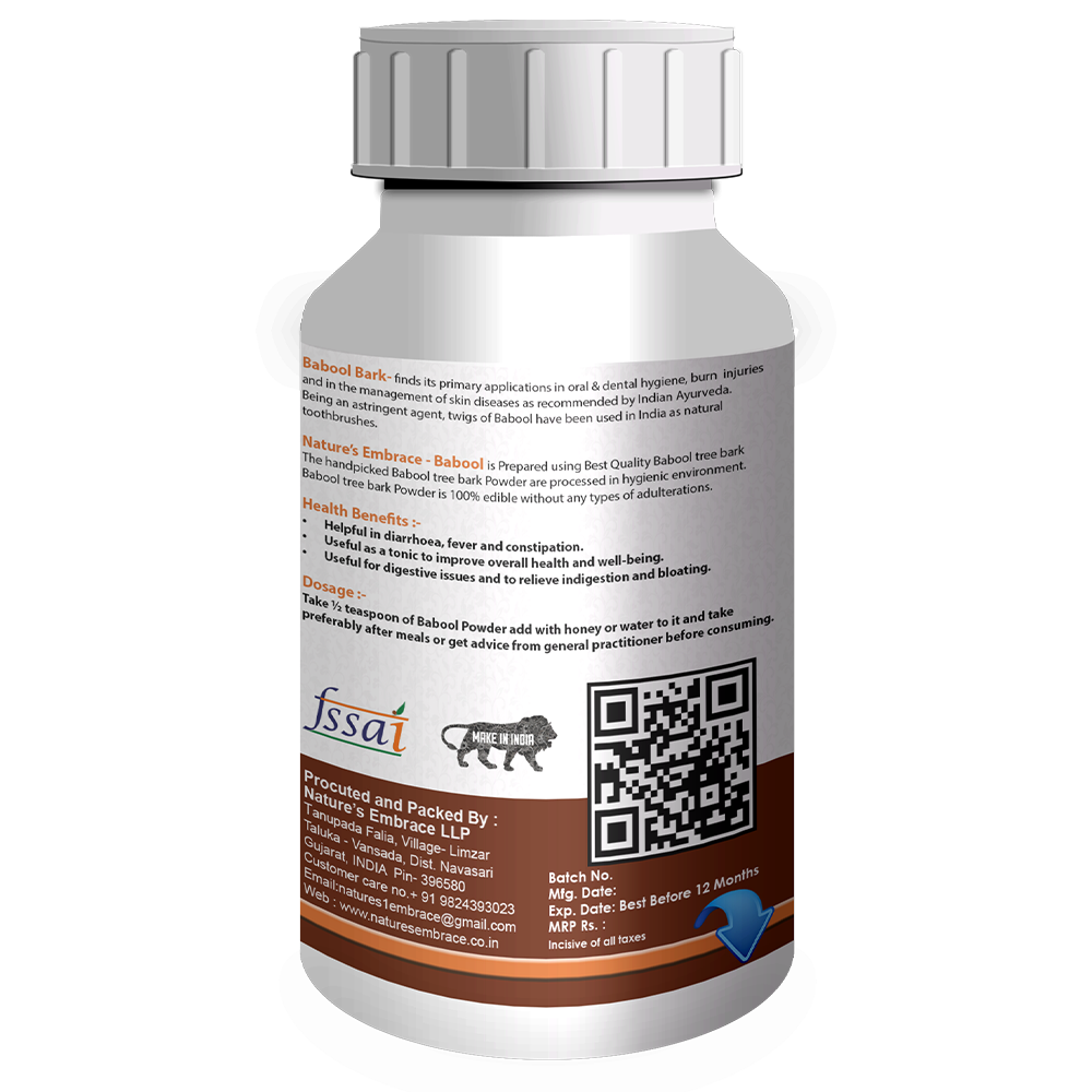 Nature’s Embrace – Babool is Prepared using Best Quality Babool tree bark. The handpicked Babool tree bark Powder are processed in hygienic environment. Babool tree bark Powder is 100% edible without any types of adulterations
