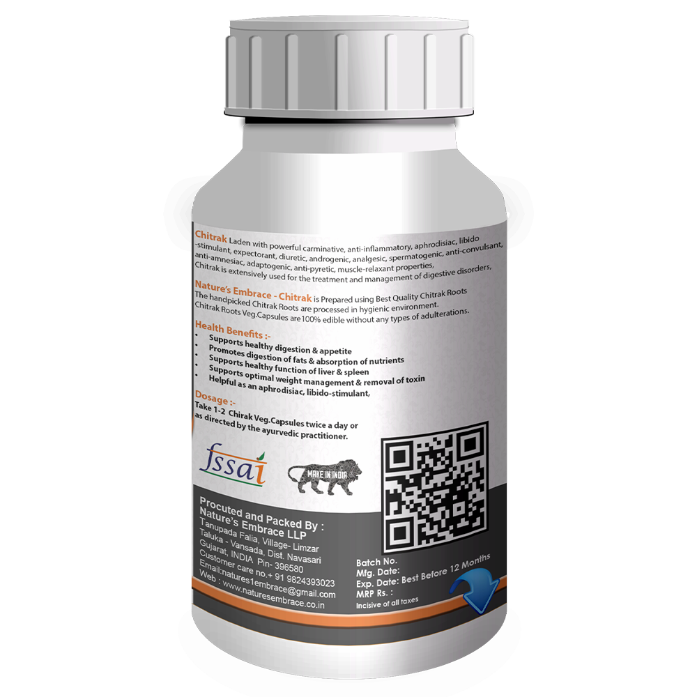 Nature’s Embrace – Chitrak is Prepared using Best Quality Chitrak Roots .The handpicked Chitrak Roots are processed in hygienic environment. Chitrak Roots Vegetable capsules are100% edible without any types of adulterations.