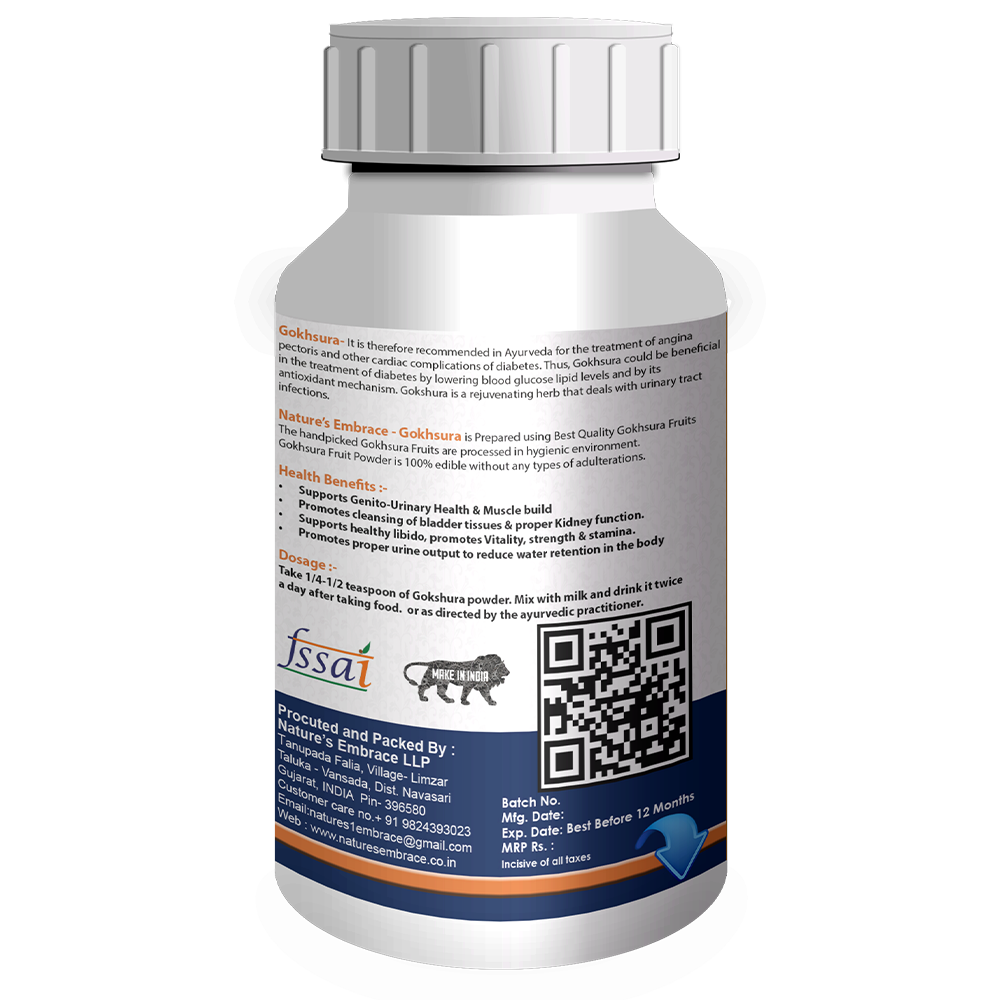 Nature’s Embrace – Gokhsura is Prepared using Best Quality Gokhsura Fruits. The handpicked Gokhsura Fruits are processed in hygienic environment. Gokhsura Fruit Powder is 100% edible without any types of adulterations..