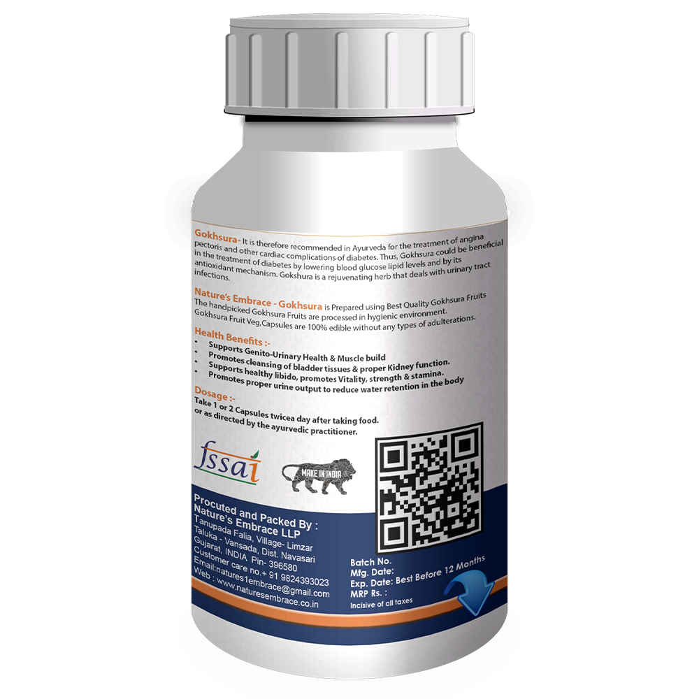 Nature’s Embrace – Gokhsura is Prepared using the Best Quality Gokhsura Fruits. The handpicked Gokhsura Fruits are processed in a hygienic environment. Gokhsura Fruit Vegetable capsules are 100% edible without any types of adulterations.