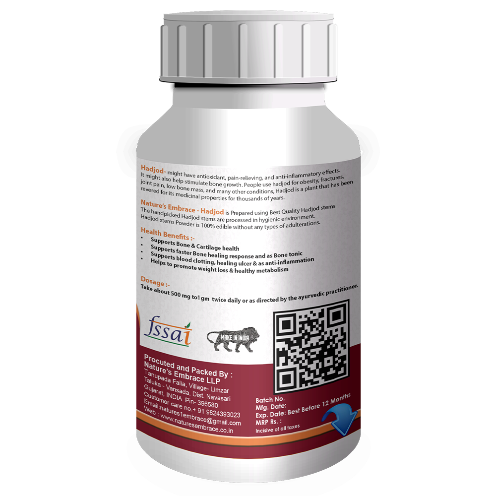 Hadjod- might have antioxidant, pain-relieving, and anti-inflammatory effects. It might also help stimulate bone growth. People use hadjod for obesity, fractures, joint pain, low bone mass, and many other conditions, Hadjod is a plant that has been revered for its medicinal properties for thousands of years.