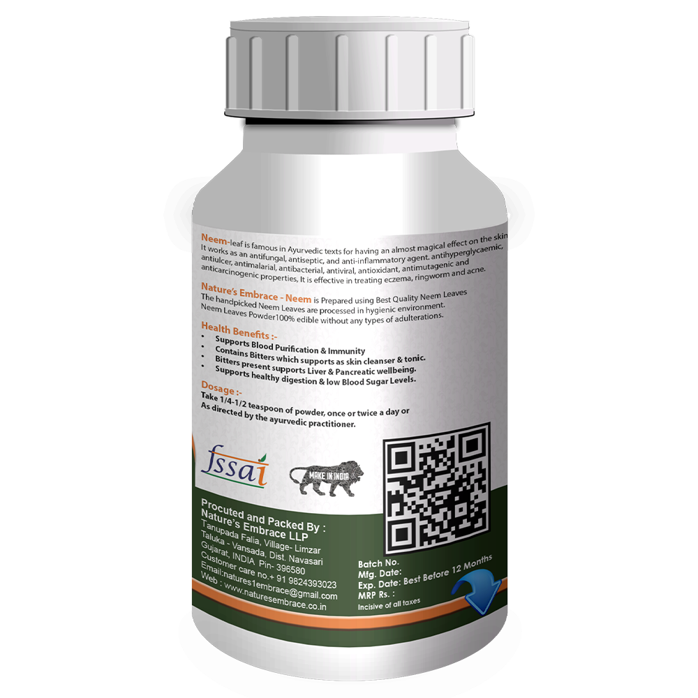 Nature’s Embrace – Neem is Prepared using Best Quality Neem Leaves. The handpicked Neem Leaves are processed in hygienic environment. Neem Leaves Powder is 100% edible without any types of adulterations.