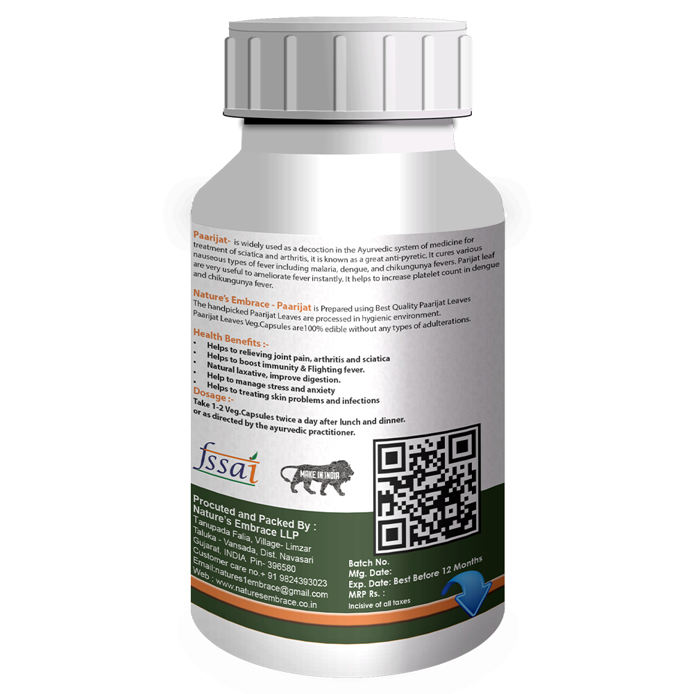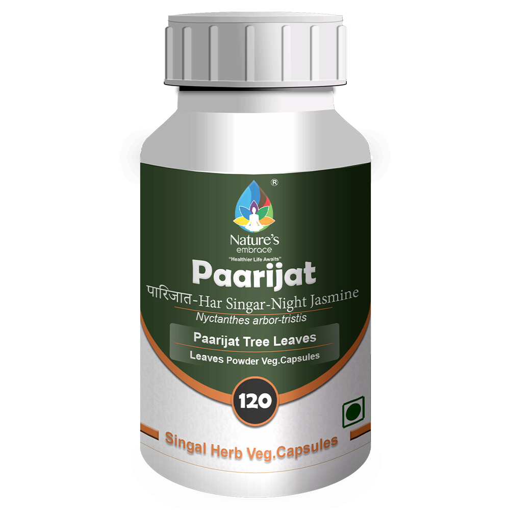 Nature’s Embrace – Paarijat is Prepared using Best Quality Paarijat Leaves, The handpicked Paarijat Leaves are processed in hygienic environment. Paarijat Leaves Vegetable capsules are 100% edible without any types of adulterations.