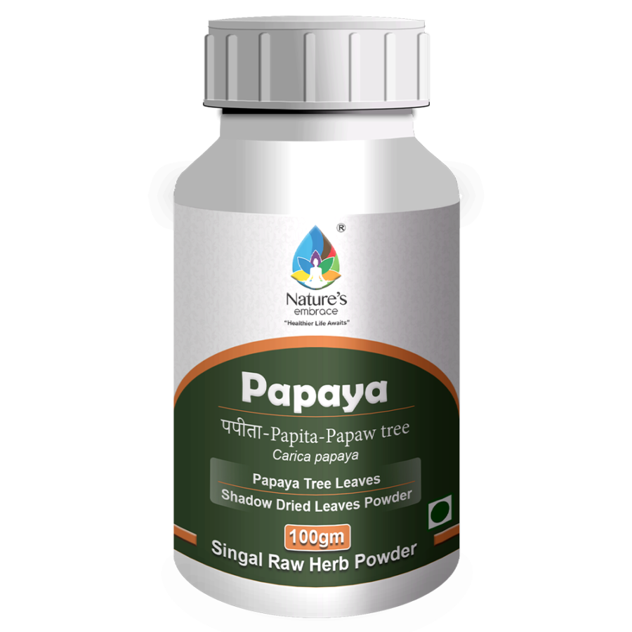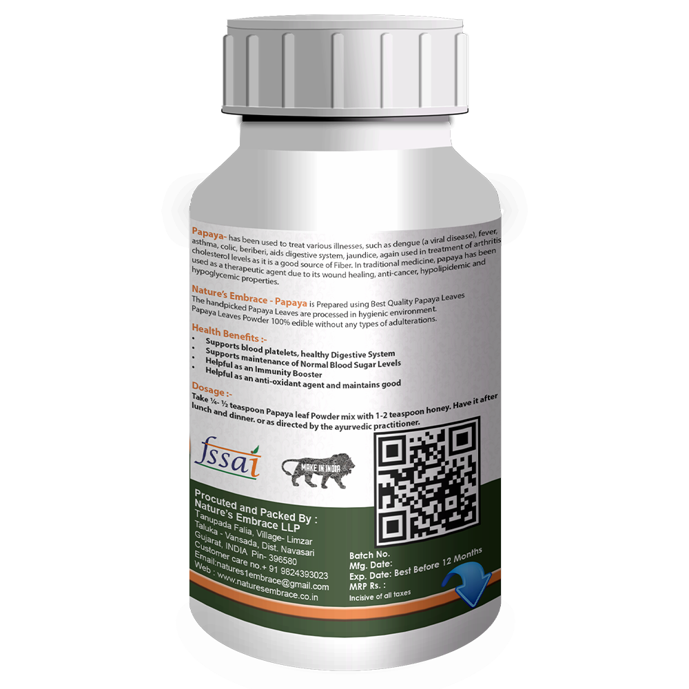 Nature’s Embrace – Papaya is Prepared using Best Quality Papaya Leaves. The handpicked Papaya Leaves are processed in hygienic environment. Papaya Leaves Powder 100% edible without any types of adulterations