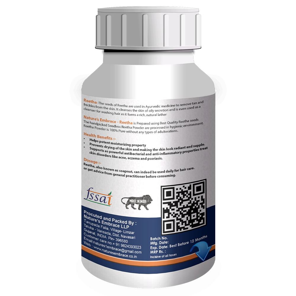 Nature’s Embrace -Reetha is Prepared using Best Quality Reetha seeds. The handpicked Seedless Reetha Powder are processed in hygienic environment. Reetha Powder is 100% Pure without any types of adulterations.