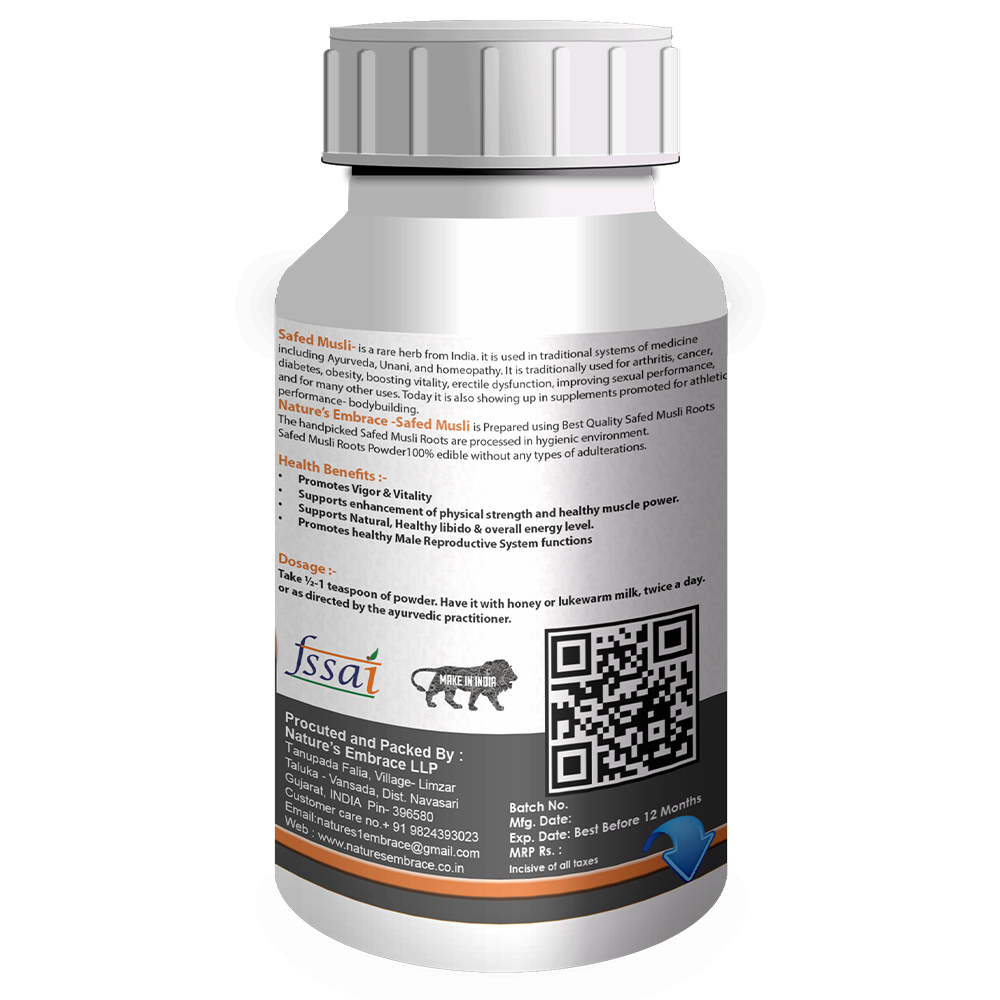 Nature’s Embrace -Safed Musli is Prepared using Best Quality Safed Musli Roots. The handpicked Safed Musli Roots are processed in hygienic environment. Safed Musli Roots Powder100% edible without any types of adulterations.