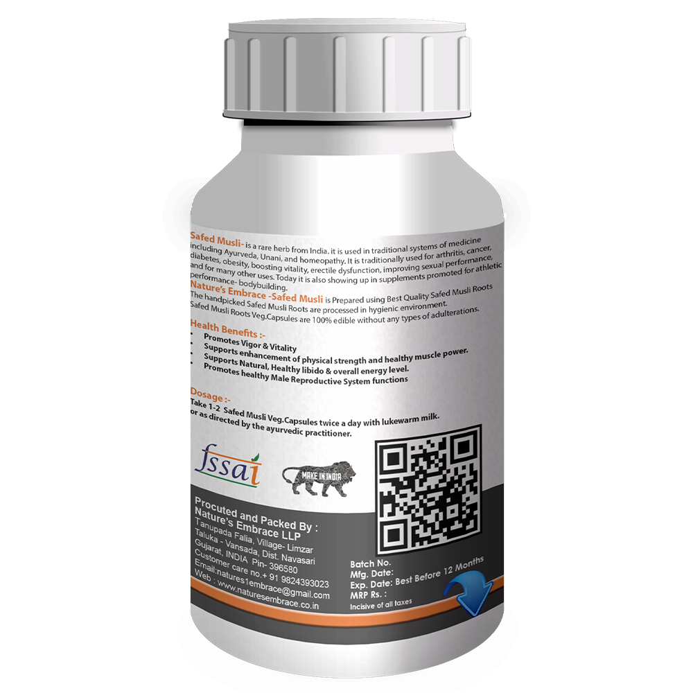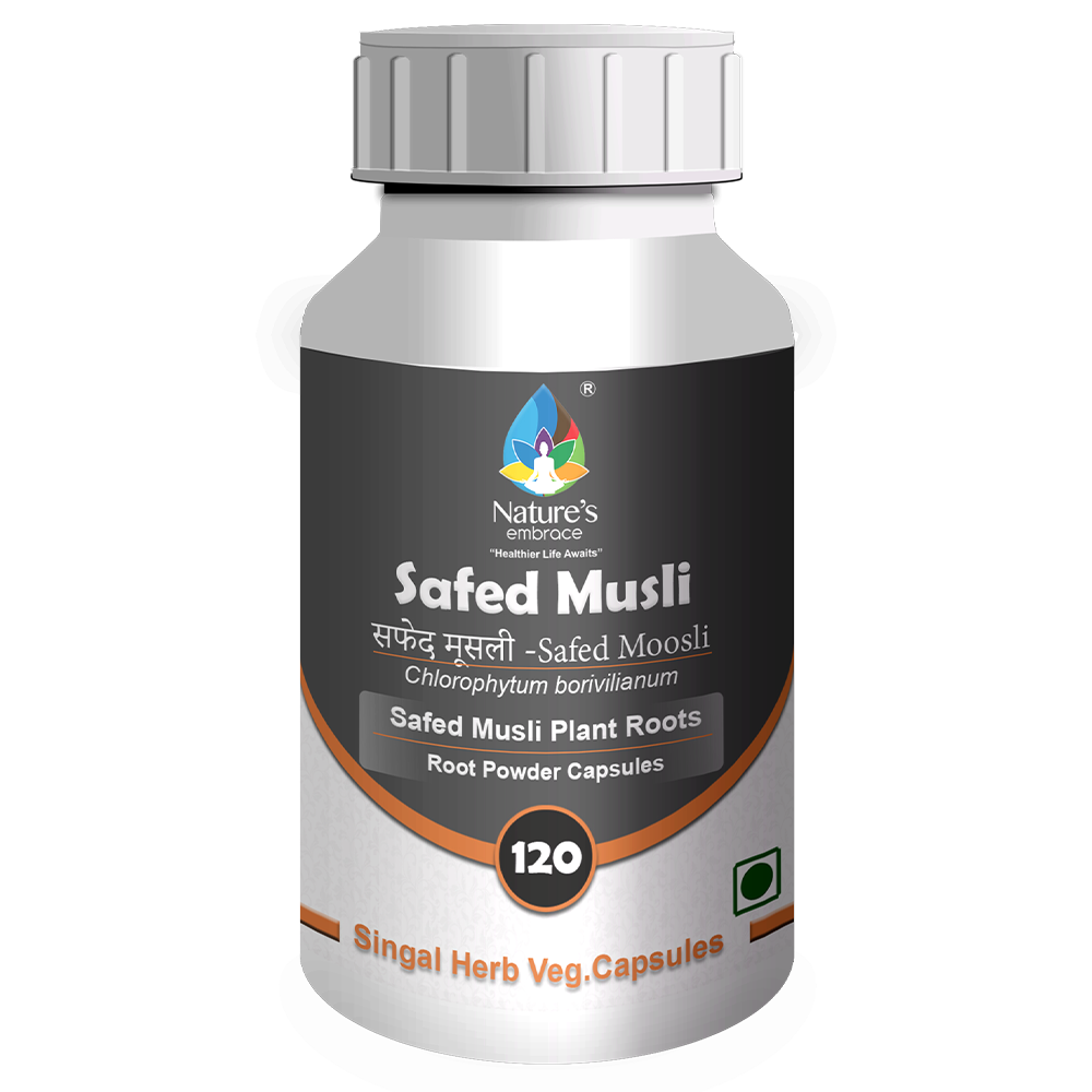 Nature’s Embrace -Safed Musli is Prepared using Best Quality Safed Musli Roots, The handpicked Safed Musli Roots are processed in hygienic environment, Safed Musli Roots Vegetable capsules are 100% edible without any types of adulterations.