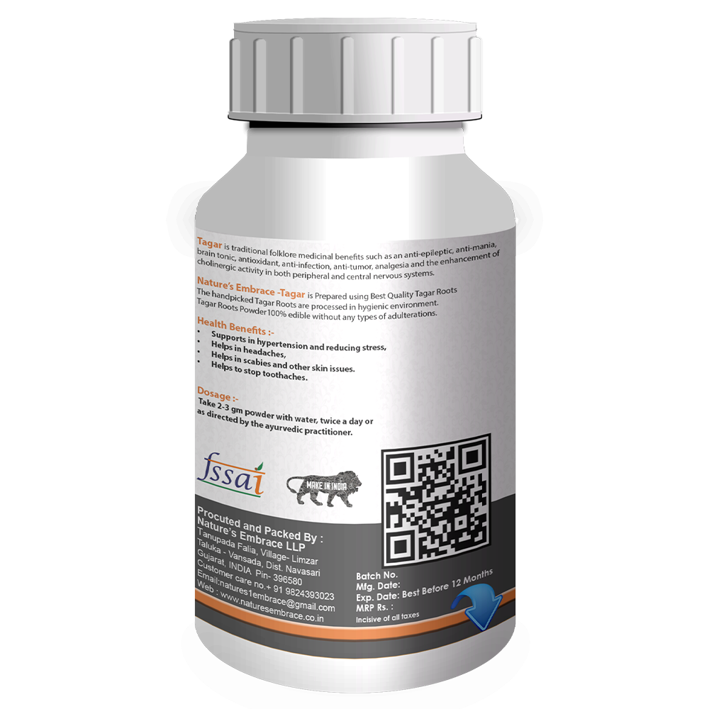 Nature’s Embrace -Tagar is Prepared using Best Quality Tagar Roots. The handpicked Tagar Roots are processed in hygienic environment. Tagar Roots Powder100% edible without any types of adulterations.