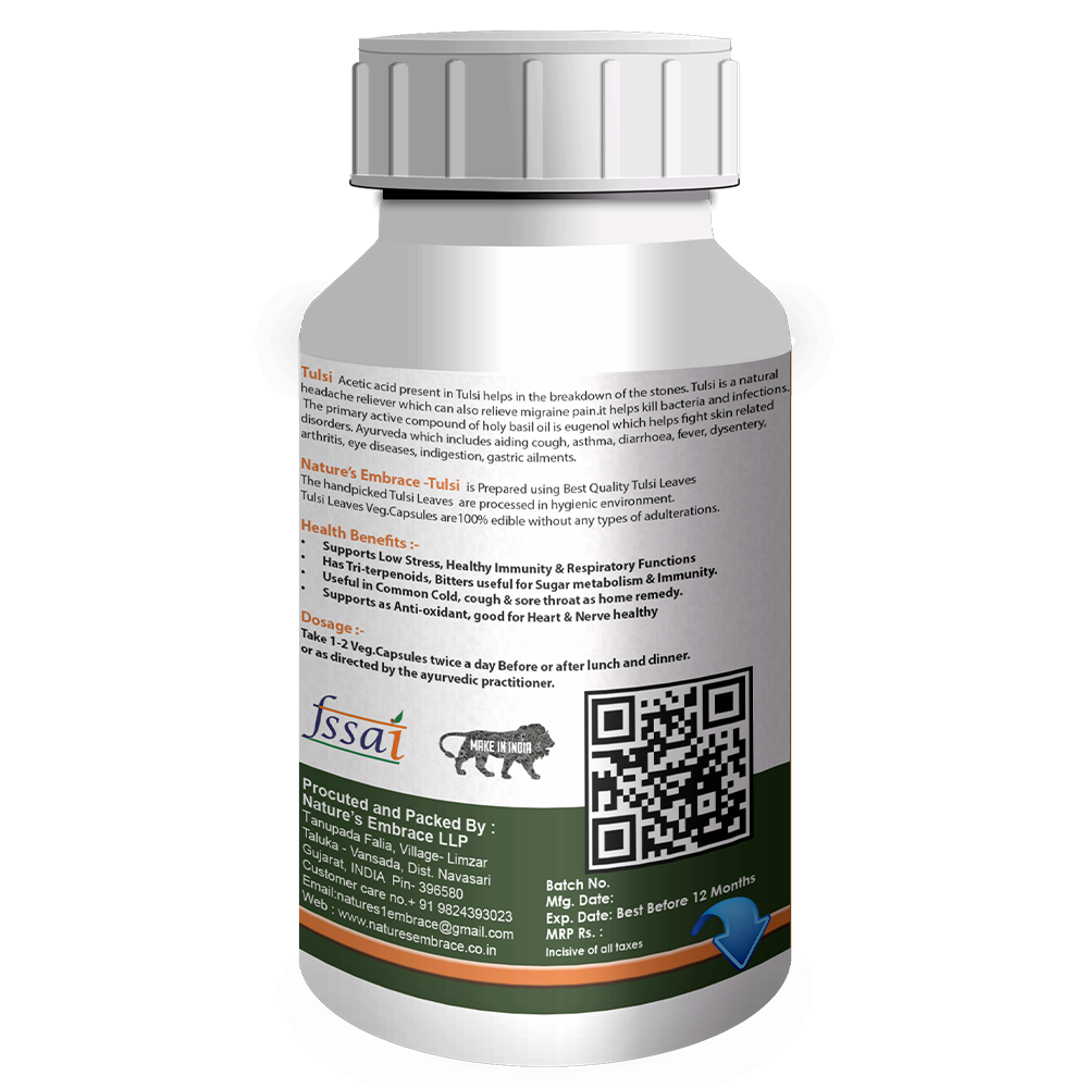 Nature’s Embrace -Tulsi is Prepared using Best Quality Tulsi Leaves The handpicked Tulsi Leaves are processed in hygienic environment, Tulsi Leaves Vegetable capsules are 100% edible without any types of adulterations.