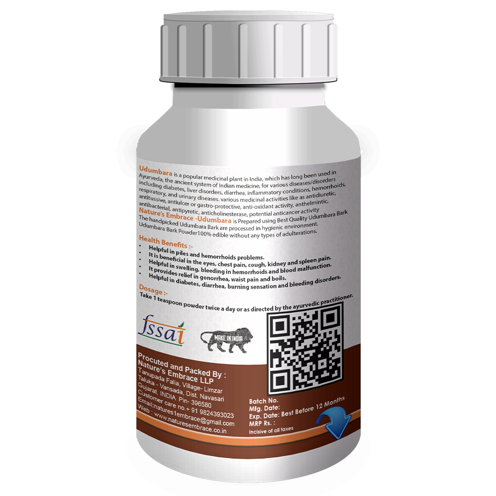 Nature’s Embrace -Udumbara is Prepared using Best Quality Udumbara Bark. The handpicked Udumbara Bark are processed in hygienic environment. Udumbara Bark Powder100% edible without any types of adulterations.