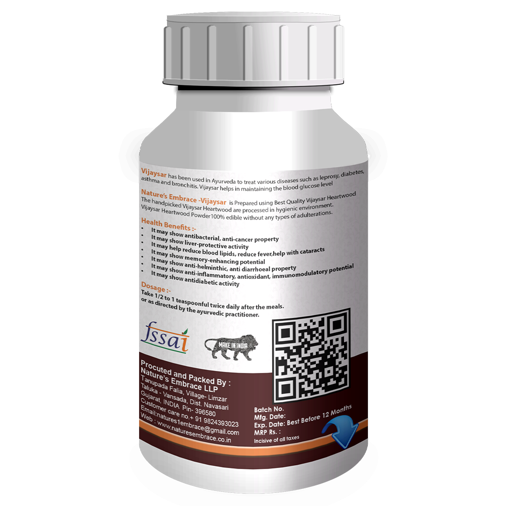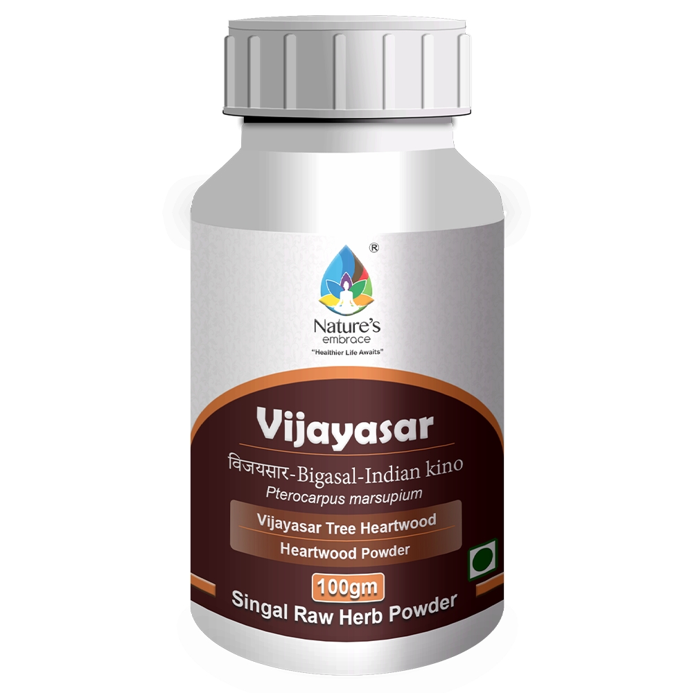 Nature’s Embrace – Vijaysar is Prepared using Best Quality Vijaysar Heartwood. The handpicked Vijaysar Heartwood are processed in hygienic environment. Vijaysar Heartwood Powder 100% edible without any types of adulterations.